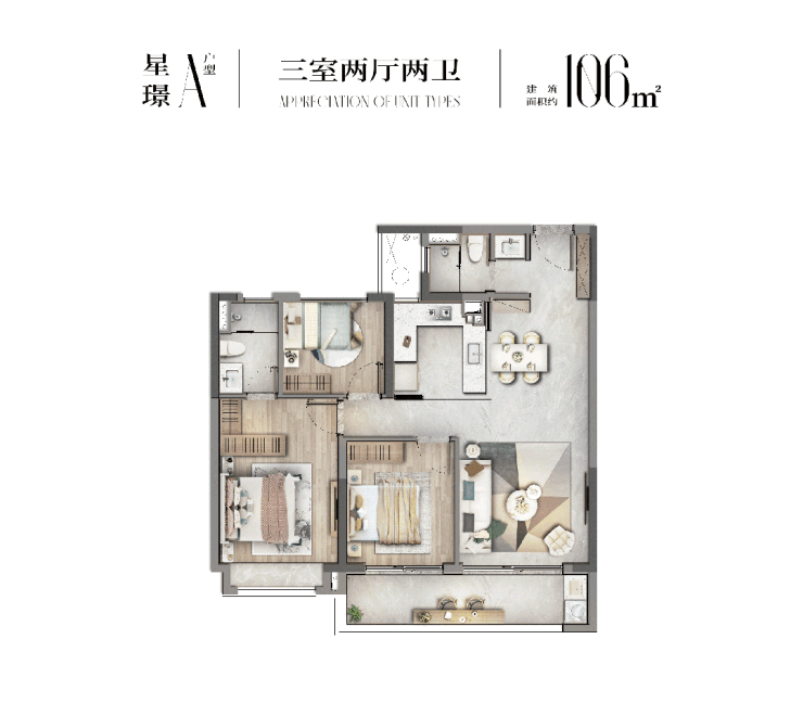 户户阔绰大开间、LDK一体化、开放式厨房与南向双联阳台,再加上三分离次卫空间、洗手台“玄关化”、套房主卧等,给到业主更具仪式感的美好体验和尊重。