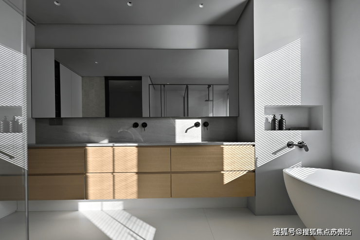 浴室贴心地做了三分离设计,完美践行了极简设计背后暗藏的功能主义.灰色与木色交融,创造出平和舒适的视觉体验.
