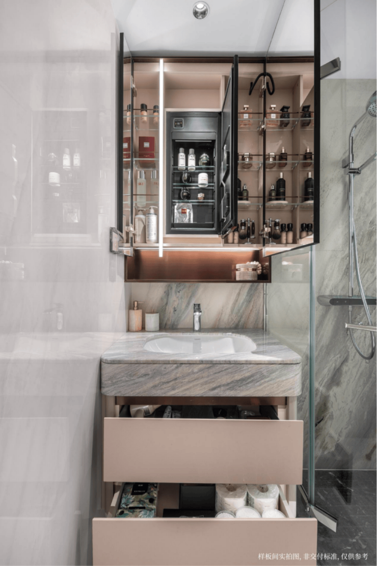 整个镜柜收纳空间,不仅设计了方便拿取的壁龛,还贴心配置了一个可调节温度的美妆冰箱,贴心储存口红面膜等护肤品。