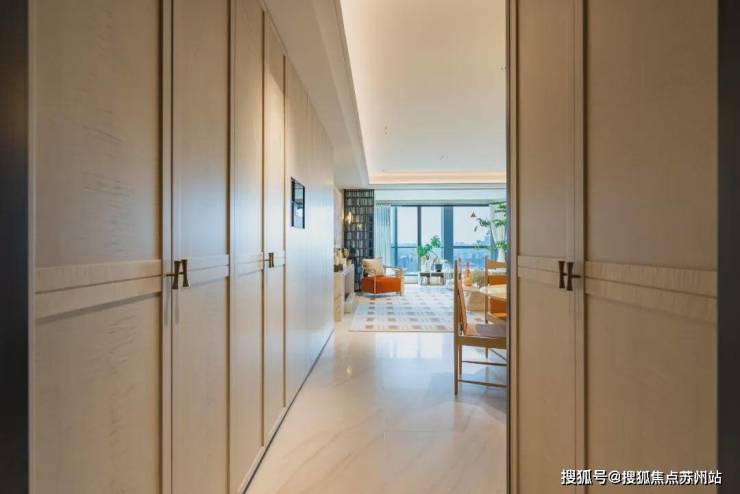 其次,建面约120㎡的过道的木饰面以及玄关储物柜门均是由影木打造。