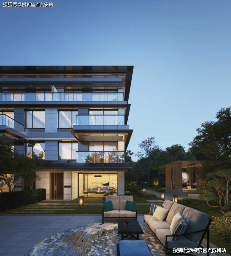 外立面:石材干挂+香槟金铝板+三玻两腔LOW-E玻璃,对标5万+豪宅标准;