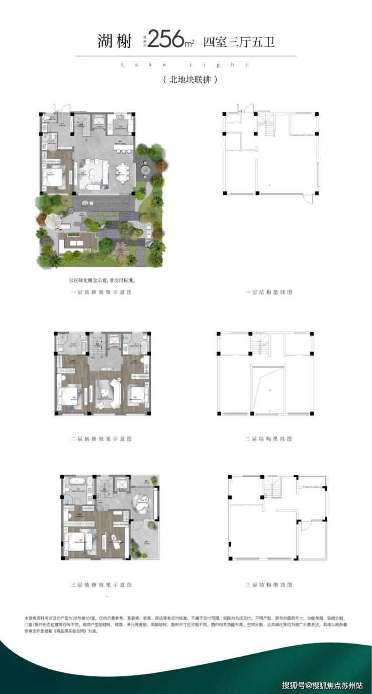 256平(四房三厅五卫)北地块联排边户户型,尊享独立入户,进出从容不迫;3面宽格局设计,空间灵活多变;特别设置阳光老人房间,便捷居者使用,安放康乐晚年;酒店式主卧套房,预设独立卫浴空间,匹配尊崇气度。