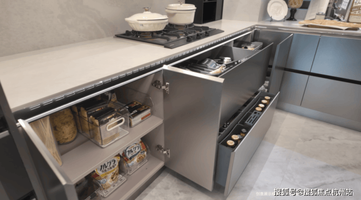 更让人惊喜的是,更高的得房率也带来了更多的收纳空间,室内收纳表现相当亮眼:从镂空门板屯菜柜到电动调味舱(120户型为手动调味舱),再到踢脚抽与倾易抽,六大超级收纳系统让厨房永葆整洁。客厅均自带餐边柜,满足业主满足多样收纳与物品展示需求。