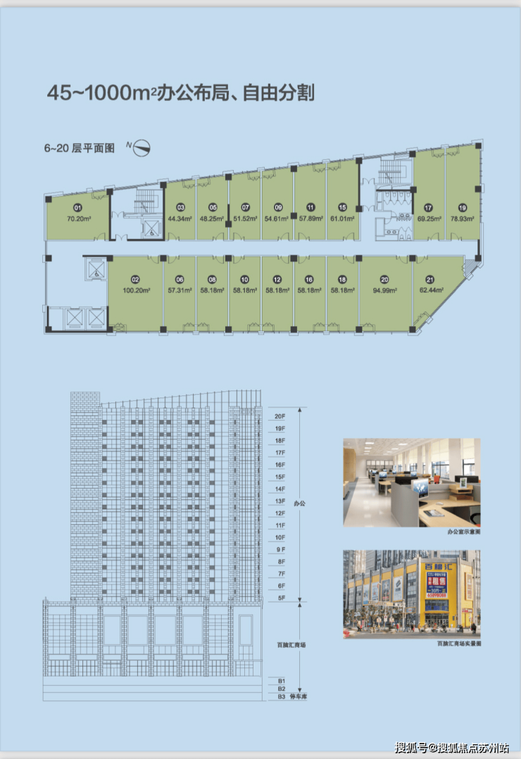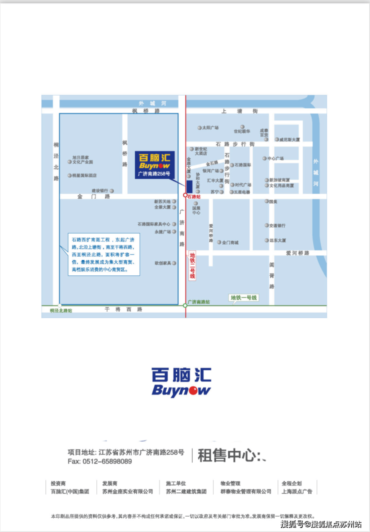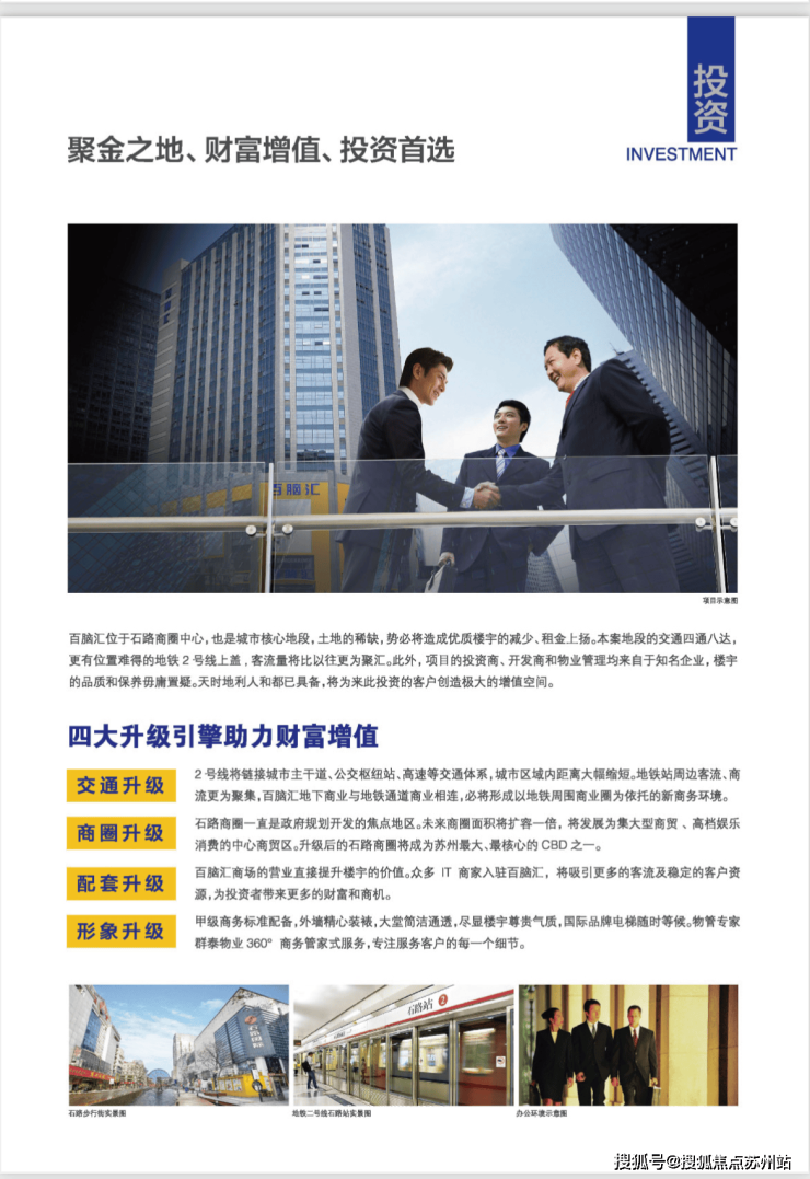 投资收益:纵观整个苏州市,石路是最密集的,以项目3公里范围内围绕多达几十个成熟社区,聚集常住人口达100万之多,居住人群档次较高,消费力较强,为我们商业整体商业的良好运营提供了强有力的保障。我们即将推出的百脑汇带租约金铺,定会是石路商圈最稀缺的稳定收益项目之一。我们即将推出现房带租约销售写字楼,即买即收益,租金收益年化约6%。