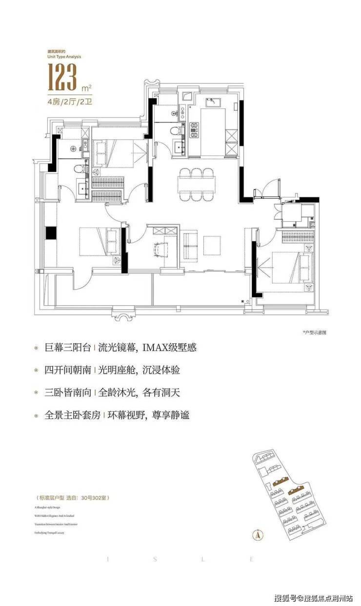 123平4房2卫,采用类一梯一户设计,非常少见的4开间朝南+4房南北通透户型.