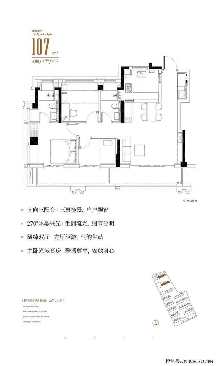 107平3房2卫,开发商号称实得率接近100%,做出了这个面积段罕见的5米面宽、9米纵深的客餐厅.