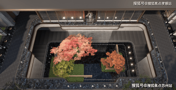 项目利用下沉式景观庭院,结合艺术花园、摩登水景等,打造了一座高端的下沉式会所,规划设有泳池、健身房、行政酒廊等场景。