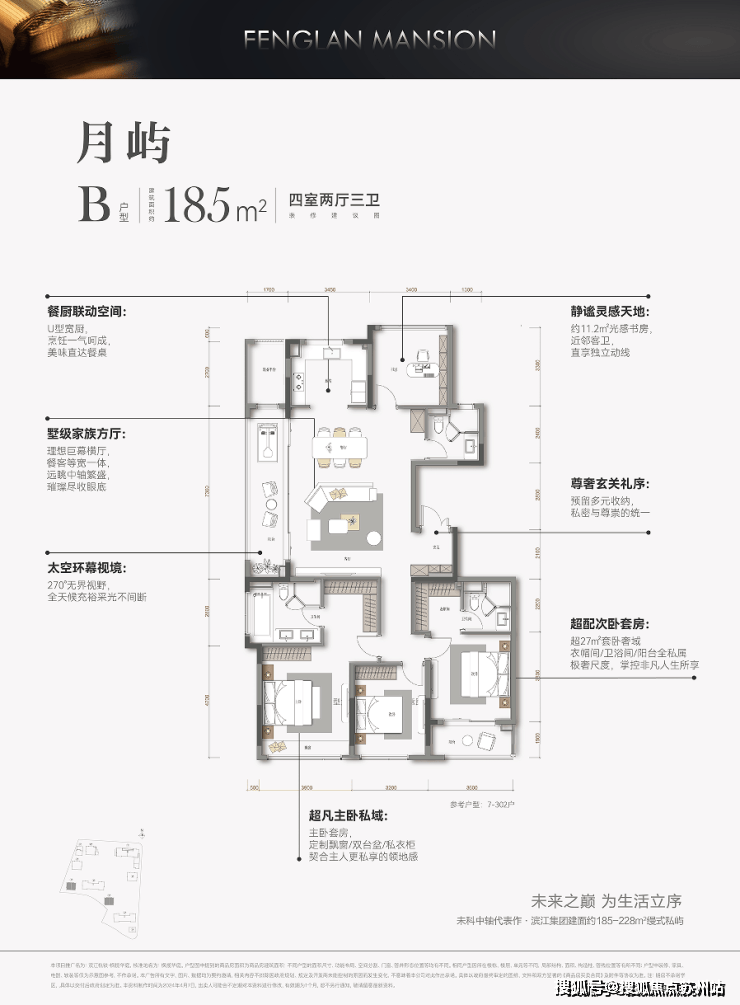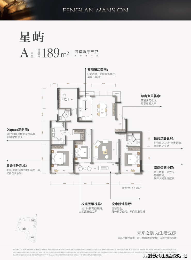 户型建筑面积为约185㎡、187㎡,223㎡、228㎡,纯改善。滨江枫揽华庭 销售电话:186-6709-7609√√【微信同号】约185㎡做四房,这是豪宅的尺度。建面约228㎡户型,则是185㎡户型的进阶版。同样三房朝南,而且每个房间都升级成了带独卫的套房!最大程度上照顾家庭成员的独立性和私密感。空间感,已经快要赶上市面上的商业大平层了。