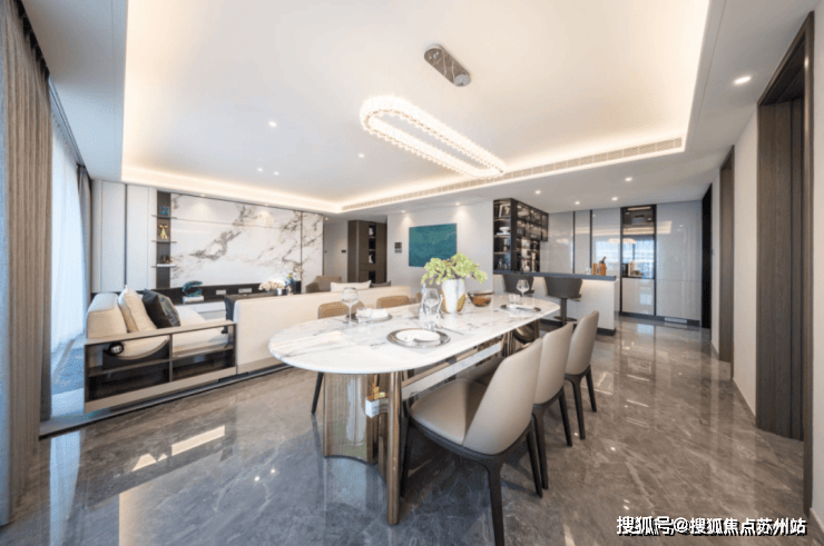 公区中,U型厨房空间足有约20㎡,还预留出了岛台和收纳柜的位置,满足高阶人士中西不同风味的烹饪需求。