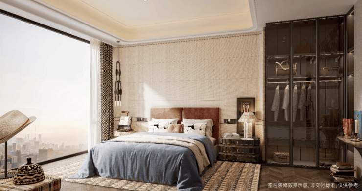一梯一户私密格局、约3米进深玄关的归家仪式,搭配近11米景观落地窗与超60㎡滨江天际会客厅,构成IMAX环幕生活剧场,满足名流沙龙、家族聚会等多重仪式感场景。双南向套房配置与约5.1米宽西南向观景阳台,让功能与尺度实现巅峰平衡。
