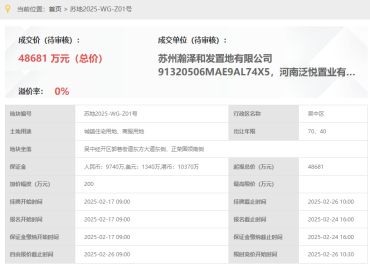 绿城凤栖东方,即,苏地2025-WG-Z01号地块项目,位于吴中经开区郭巷街道东方大道东侧、正荣国领南侧,是2月26日,中电建以底价48681万元竞得,成交楼面价17902元/平。