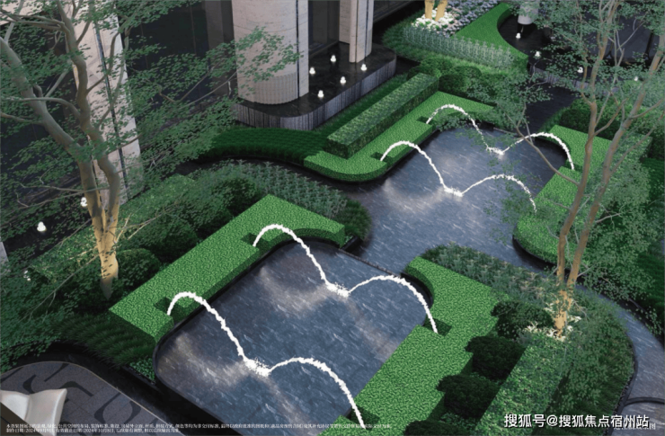 中央休闲庭院空间,一场浸润灵感的艺术水景,自然与潺水和鸣间,海上·清和玺售楼处电话400-8123-664分享生活的乐趣与奇妙.