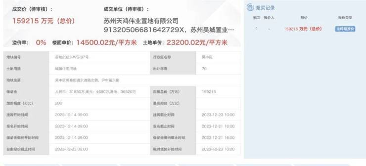 该地块即苏地2023-WG-97号地块,2023年年底,由苏州天鸿伟业置地&苏州吴城置业联合拿下,底价成交,成交楼面价14500元/平,成交总价159215万元,溢价率0%。