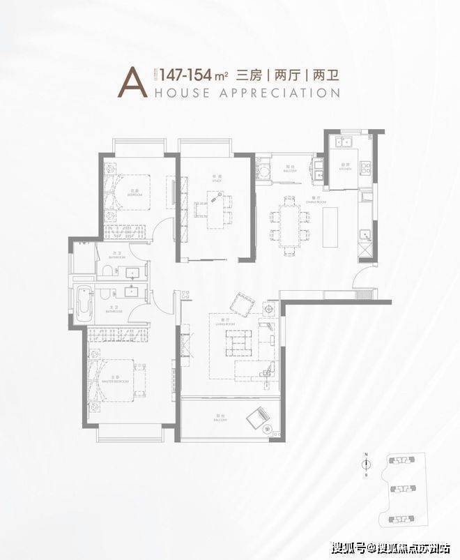 建面约150㎡左右的大三房,通透方正, 整体客厅面宽约4.5米,主卧面宽约4米,空间感十足!独立玄关、中西双厨、南北双阳台、卧室全飘窗,每个空间都阔绰舒展,让人松弛感拉满。