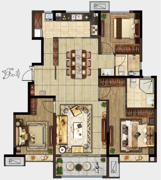 年轻人的168㎡大套间,4房3厅2卫设计,7米宽的大客厅开间,主卧套南北通透,四开间朝南,符合我们对寻常大平层户型的期待。