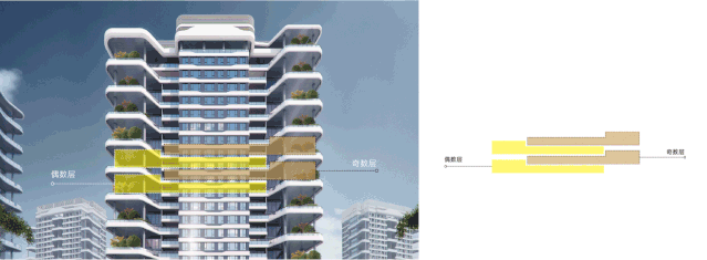 该项目为了实现空中庭院与客厅的对位互通,所有户型的客厅随露台进行空间换位,进而实现每个户型的客厅与露台真正融为一体。