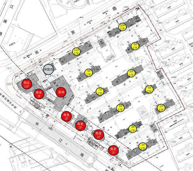 项目总建筑面积18.8万㎡,地上计容总建筑面积12.48万㎡。根据项目规划设计方案:项目拟建11栋12-17层可售住宅,总户数876户,可售住宅约807套;另需建设1栋保障性住宅房,靠近长江南路一侧规划有酒店、商业、菜场、社区食堂等业态。