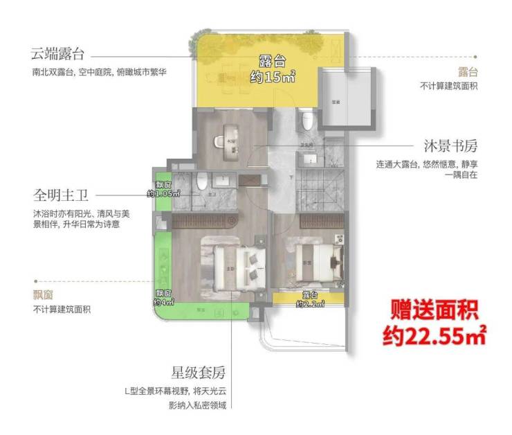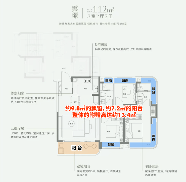 这个户型有约9.8㎡的飘窗,约7.2㎡的阳台,整体的附赠高达约13.4㎡。这是目前上海外环沿线,是附赠率最高的一个小高层产品。
