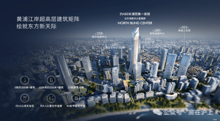 项目具体位于北外滩“一心两片”规划中的“一心”——中部核心商务区。这里正快速崛起为世界级的商务集聚区,规划有18栋摩天大楼,包括在建的480米浦西第一高楼,以及来福士、白玉兰广场、华贸中心等顶级商业地标,目前已吸引超过35家跨国公司总部和百余家大型企业入驻,未来将是上海经济密度最高的区域之一。