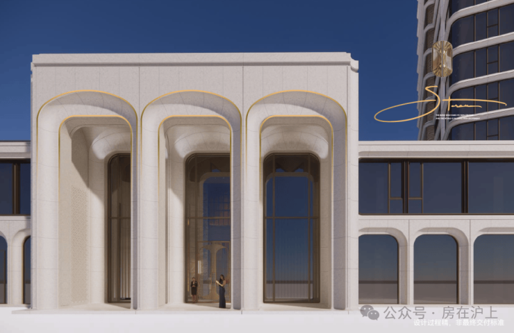 萃取礼查饭店孔雀厅“三心拱”的稳定构图与承重优势,将其融入建筑基座设计,米白色石材勾勒的拱券线条,既保留历史建筑的厚重质感,又避免复古的繁复压抑