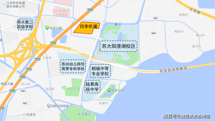 四季听澜的地理位置非常优越,位于苏州园区金鸡湖向北第一站的阳澄西湖教育组团板块。这里毗邻园区、高铁新城、青剑湖和相城主城四大都市核心CBD,交通路网四通八达。中环北线、太阳路高架与苏州北站高架路及济学路共同组成了“两横两纵”的路网格局,未来随着阳澄湖星济隧道的通车,项目到园区湖西的交通将更加便捷。此外,项目紧邻地铁8号线古香圩站,可与地铁1号线及2号线无缝换乘,出行非常方便。