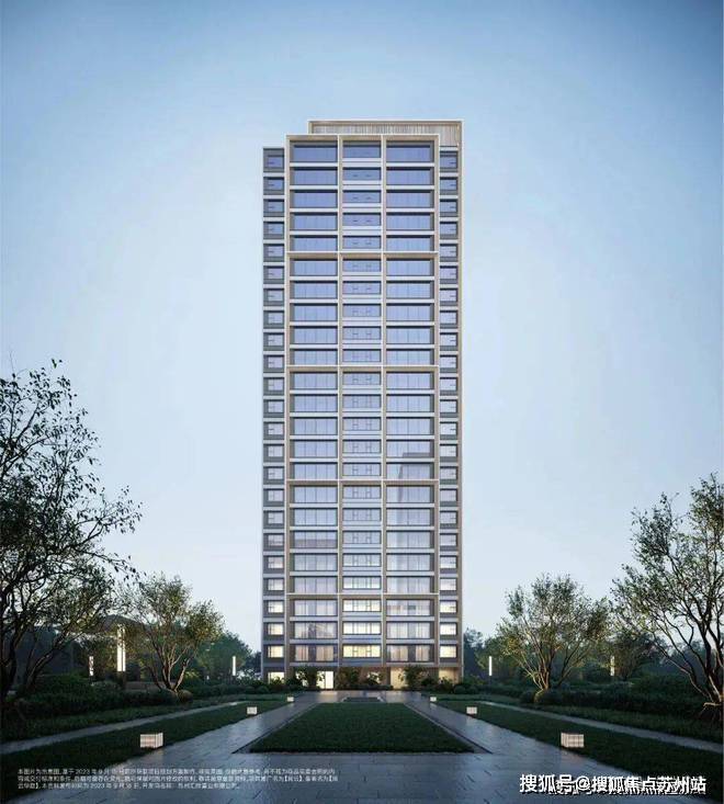 以舒朗的水平横向线条与全面屏大面玻璃塑造现代轻盈的建筑特质;顶部暖色竖向香槟金色格栅形成格调典雅的塔冠形象。