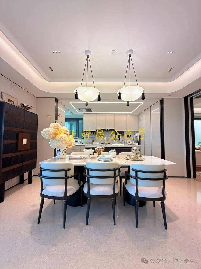 厅内空间充裕,既容得下大家庭聚餐的超大圆桌,也有独立西厨岛台,满足高净值家庭多元烹饪需求。