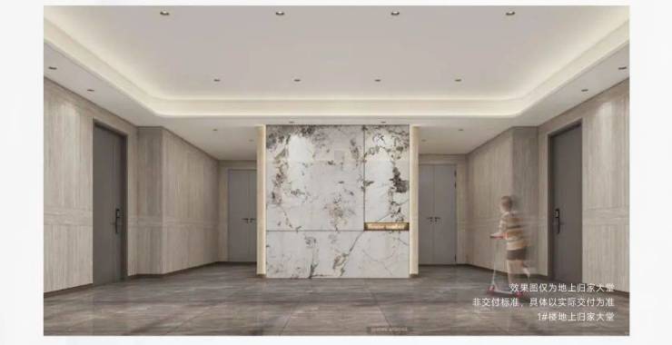 注重归家的仪式感,更重视心灵的归藏,奢装地上入户大堂,公区墙面地面均采用仿石材墙砖,大堂主背景采用仿石材岩板,搭配古铜色不锈钢踢脚线收口线,营造尊崇的入户体验,彰显奢宅生活主张。