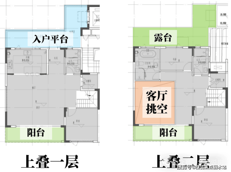 * **叠墅的高附加值**:上叠赠送屋顶露台,下叠赠送的“地下室”因车库上移而位于实际的地面一层,空间更加实用。宣传的得房率较高(洋房约85%,叠墅约88%)。