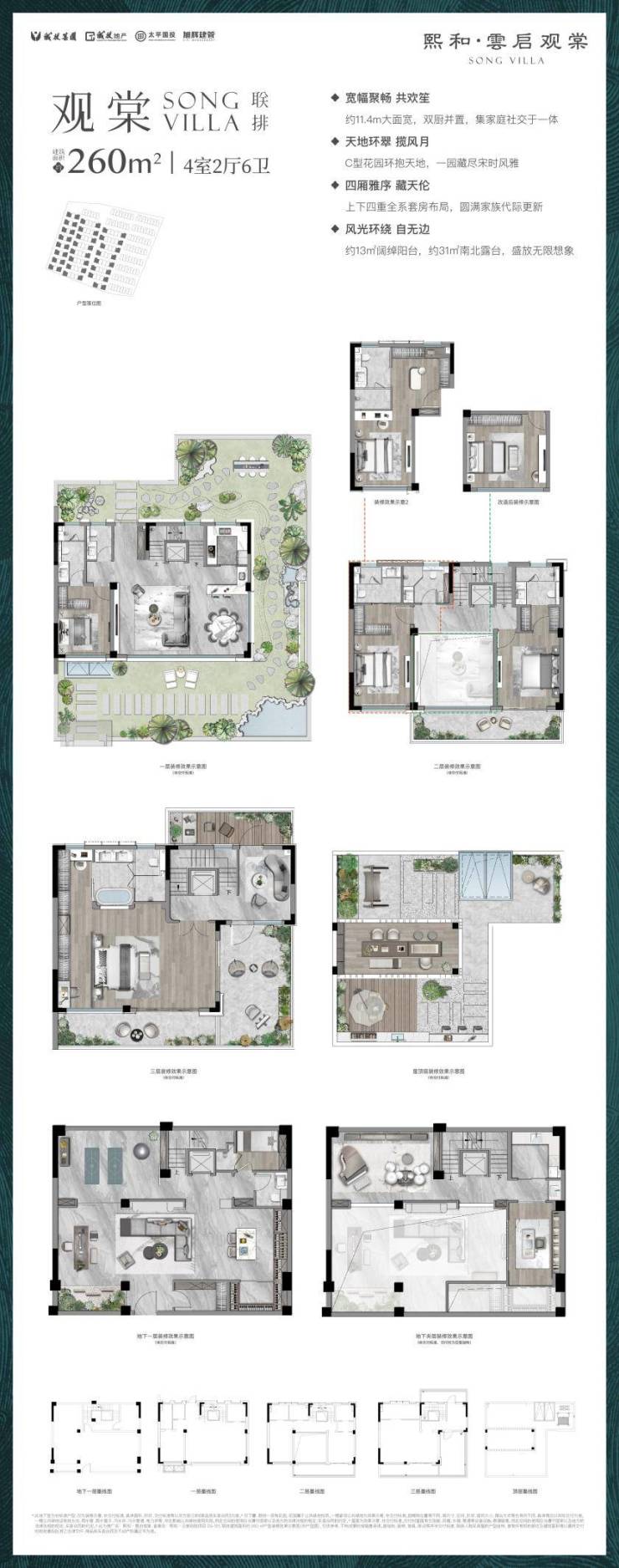 下叠(约160㎡):约4房3卫,面宽约7.4米,赠送挑高客厅和一个围合式的C型院子,地下空间也一并赠送。