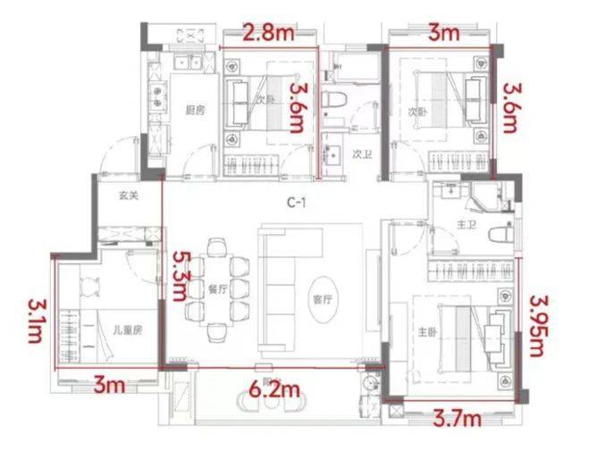 它不仅做到了四房设计,更是做到了6.2米的宽厅,尺度媲美大平层,北向房间还能够放置1.5米的床。