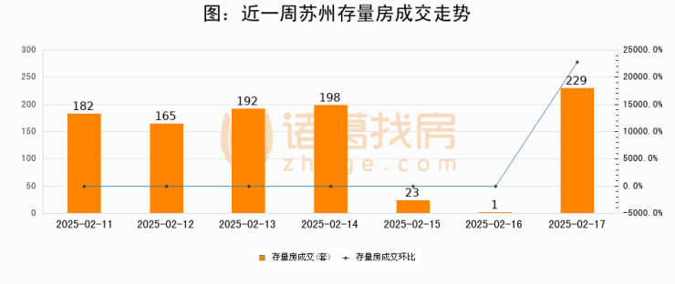 从存量房来看,2025年02月17日苏州存量房单日成交229套,比昨日增加228套,环比上涨22800%。从近一周存量房成交来看,苏州存量房日均成交套数为141套,02月17日单日成交229套,高于近一周平均水平62.4%。