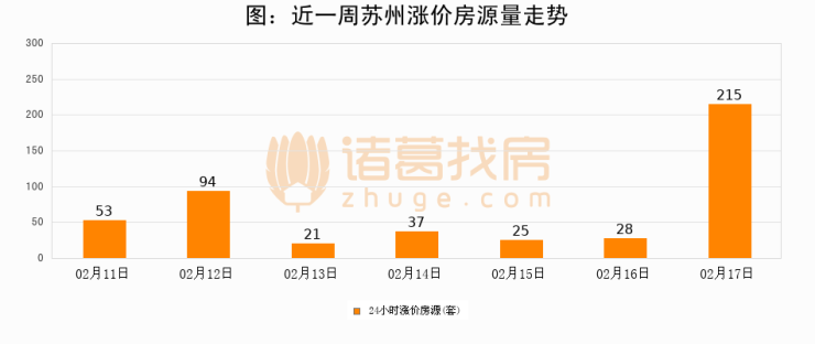 根据诸葛找房数据显示,苏州24小时涨价房源量为215套,较02月16日增加187套,环比上涨667.9%。与此同时,涨价房源占比小幅扩大,业主信心有所提升。
