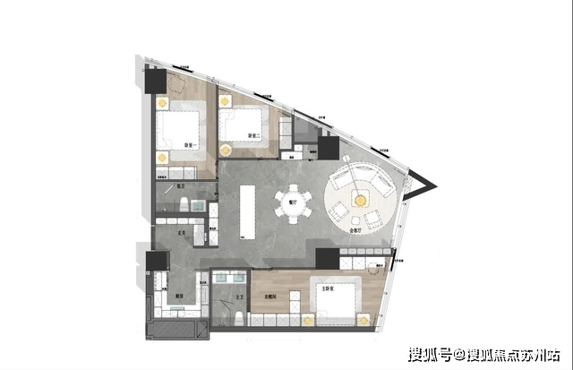 客厅空间舒适,电视背景面完整,可设置闭合式移门,拓展客厅空间的多用性;