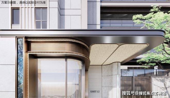 在楼栋主入口同样运用石材+弧形铝板等元素,同时还有格栅装饰,质感提升明显: