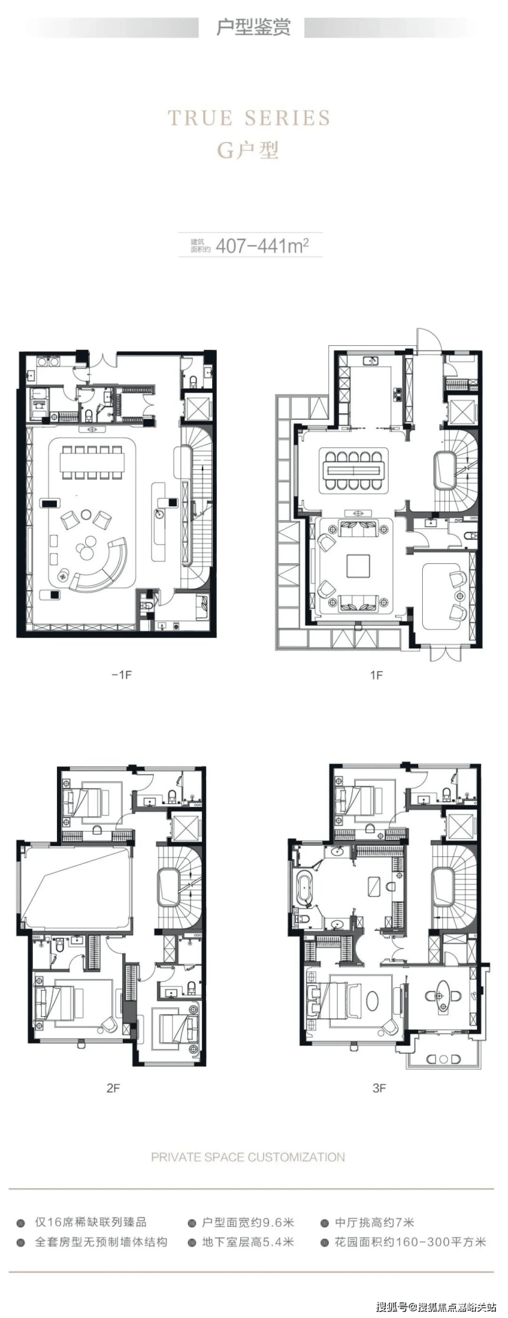 * **产品形态纯粹**:项目为纯别墅社区,包含联排和叠拼产品。主力户型面积段在184-407平方米之间,均为大面积改善户型。容积率低(0.7-1.0),绿化率达35%,提供了市区内稀缺的、静谧的高端居住氛围。