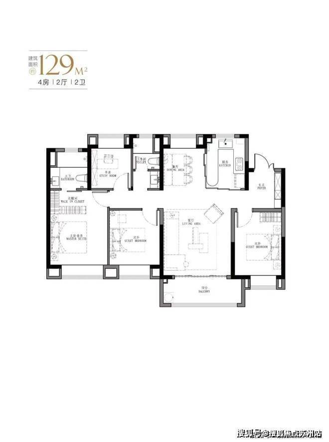 产品:103㎡、107㎡的三房两厅两卫及123㎡、129㎡的四房两厅两卫。