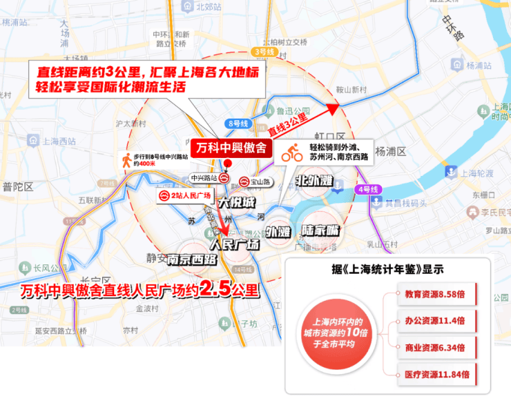 相较于虹口、杨浦,中興傲舍占据天然地理优势,以项目为中心直线距离约3公里范围内,南京西路、人民广场、外滩、外白渡桥、陆家嘴等城市地标星罗棋布。