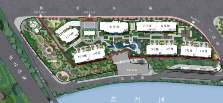 根据规划图显示,1、2、3、5、9、10号楼为4层;6、7号楼为10层/12层;8、11号楼为22层。东侧部分为商业、办公用地,包括一栋办公塔楼及附属裙房。
