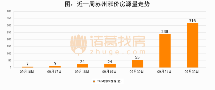 根据诸葛找房数据显示,苏州24小时涨价房源量为316套,较09月21日增加78套,环比上涨32.8%。与此同时,涨价房源占比小幅扩大,业主信心有所提升。