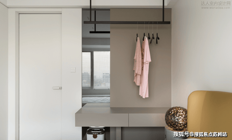 次卧通过丰盈的功能性展现房屋居住者的待客之道,不大的卧室在进行了精致分区后,充分利用墙面和边角区域,做出了梳妆台、更衣区、休息区以及收纳柜,床体周围的空间进行了“完美三分离”,满足客人的任何需求。