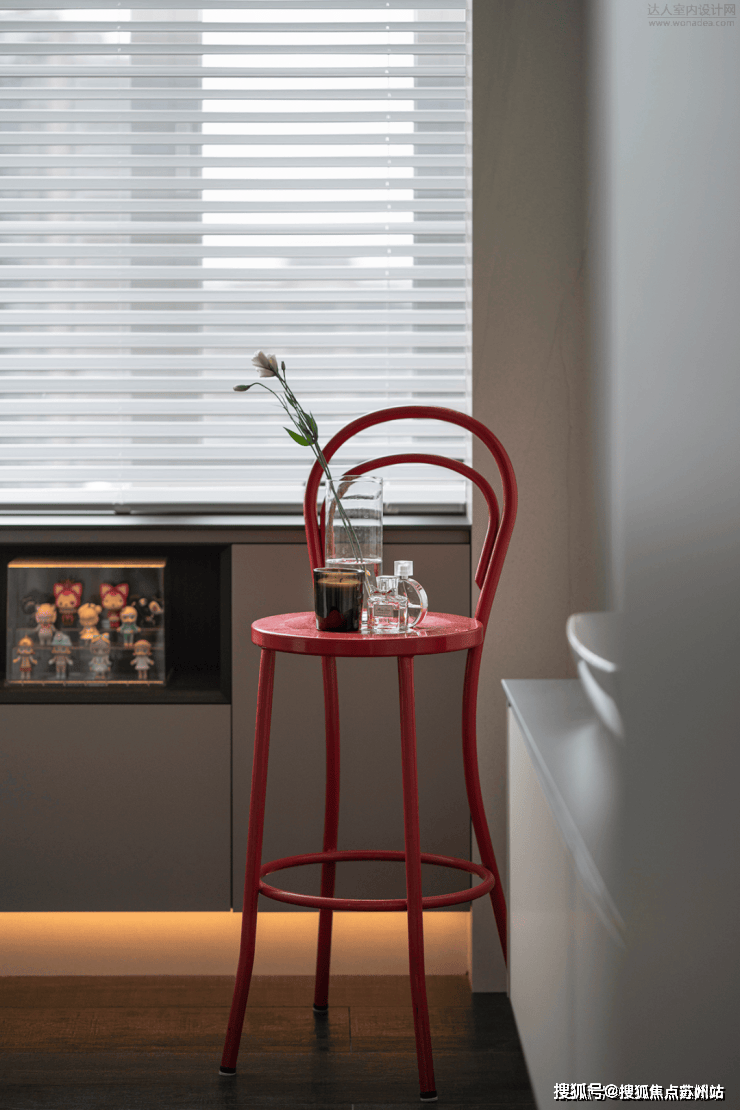 浴室中,一把红色的座椅轻盈又夺目,与后侧如火一般的地台灯带彼此呼应,座椅表面的香薰烛台透露着私密空间的精致。
