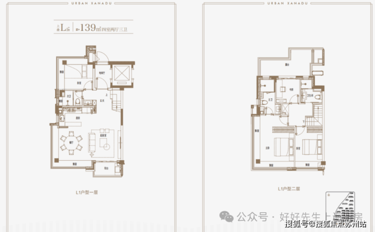 建筑面积约139㎡上叠边套户型,四层是会客区,五层是居住区。