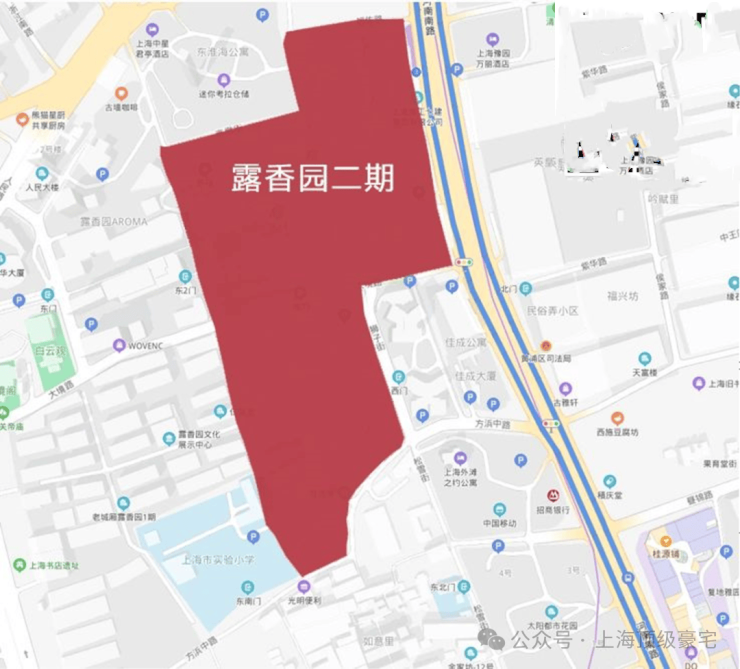 露香园二期地块,位于黄浦区老城厢核心地段,北至高墩街-福佑路,南至方浜中路-昼锦路,东至河南南路-狮子街,西至露香园路,与露香园一期紧密接壤.东临豫园和外滩,地理位置优越,临近10号线豫园站.