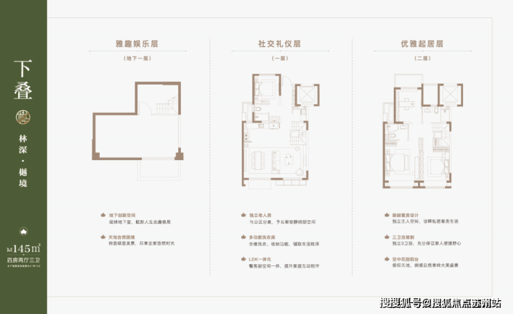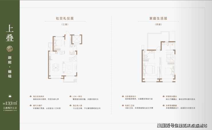 有更大尺度的改善需求可以选择项目的叠墅。叠墅产品分为4F、6F层叠加, 主力产品建面约 约122-133㎡上叠,132㎡大平层,131-145㎡下叠。