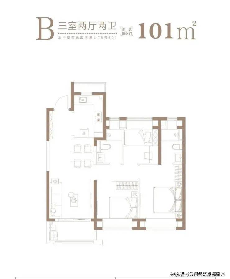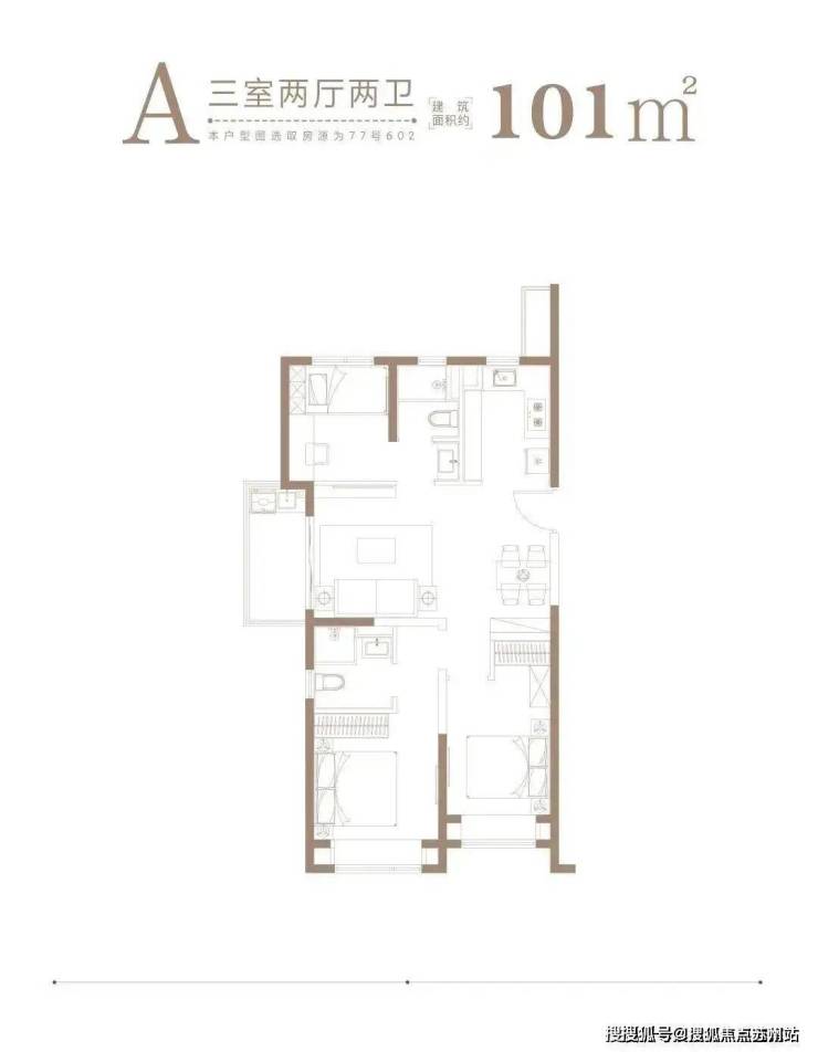 1、约101㎡均为3房2厅2卫,A、B户型分别是边套、中间套,满足不同人群的居住需求。