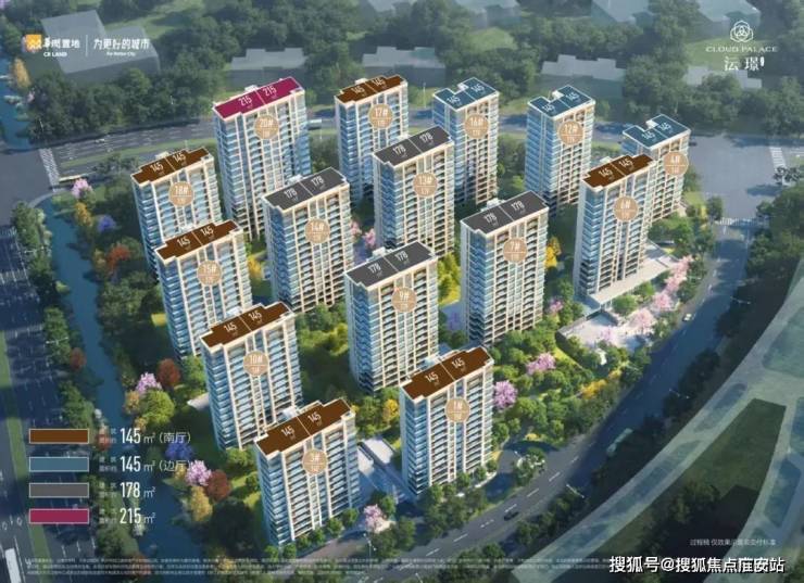 小区规划15幢住宅,包括2幢14层、1幢15层、1幢16层、10幢17层及1幢18层,整体呈北高南低、轴对称布局。户型设计以改善型为主,共提供145㎡、178㎡、215㎡三个面积段。项目定位偏向中高端改善市场,建筑布局和立面风格注重品质感,符合现代住宅审美趋势。