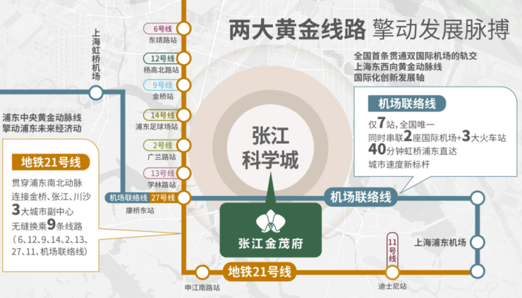 地铁21号线(在建中),进一步打通项目与张江的价值链条。 4站到达张江科学之门所在的学林路站 ,还 可换乘康桥东站与机场联络线 (已开通运营),可以覆盖张江各个重要产业园。 预计2026年年底实现通车运营,项目交房后就可以直接享受地铁通勤的便利!