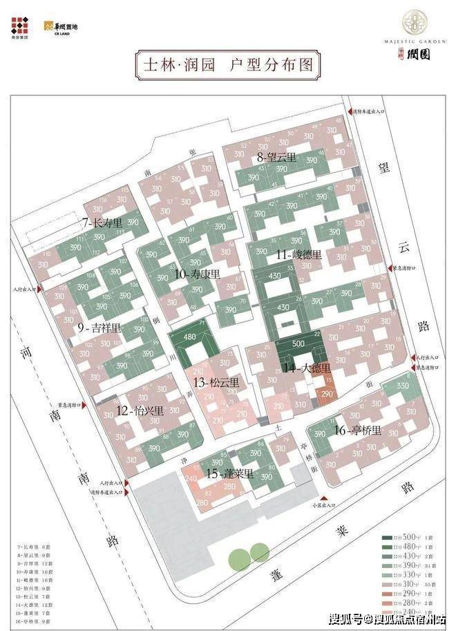 合院地上三层,面积段约270-500㎡,计合院82套.