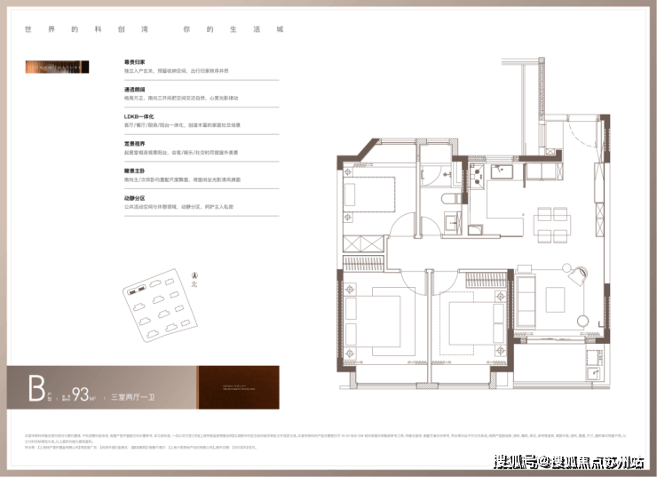 约93㎡、101㎡正三房户型均做到三开间朝南,采光与通风俱佳。以 93㎡户型为例: